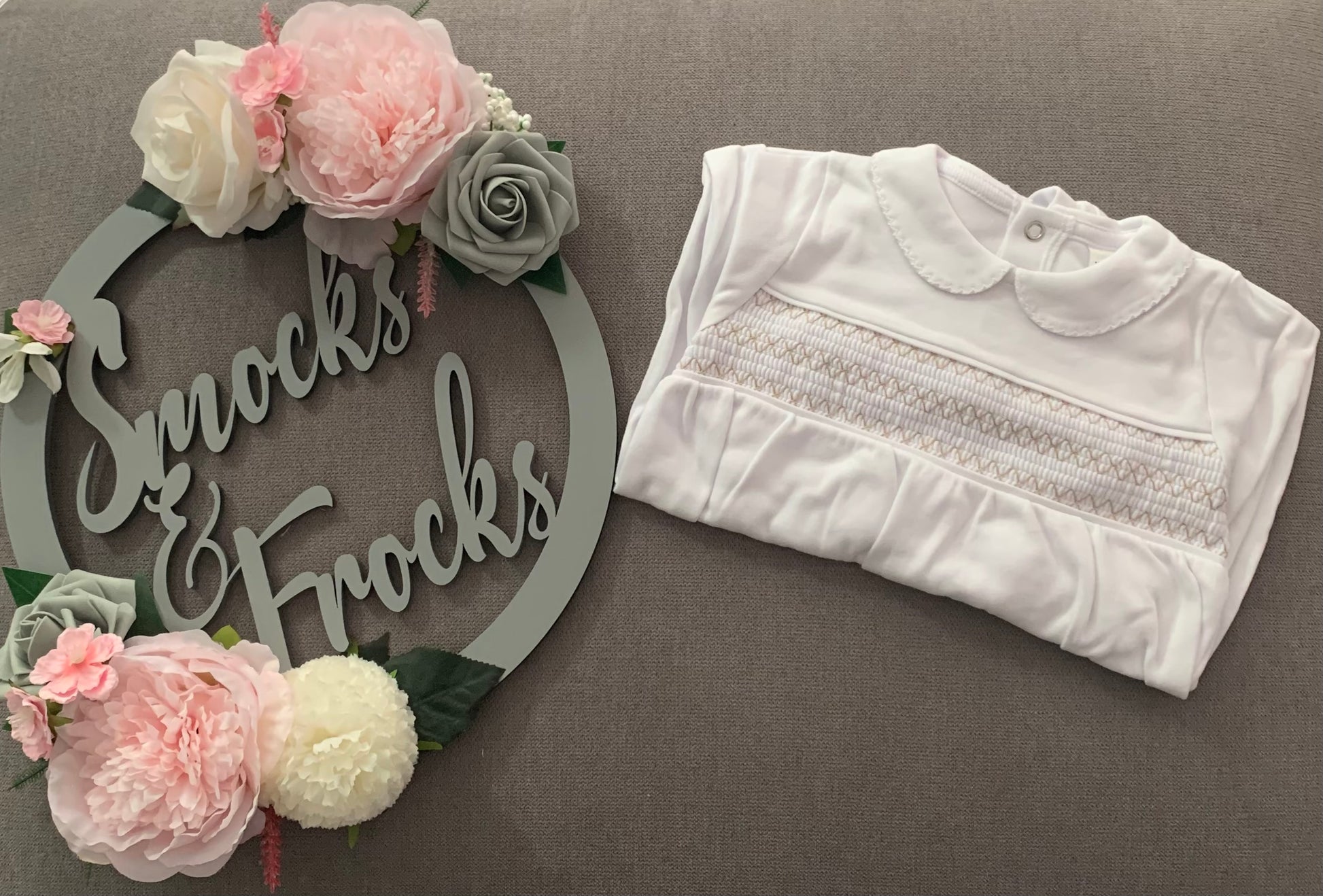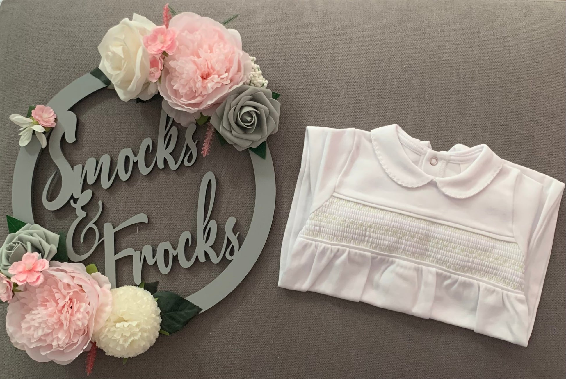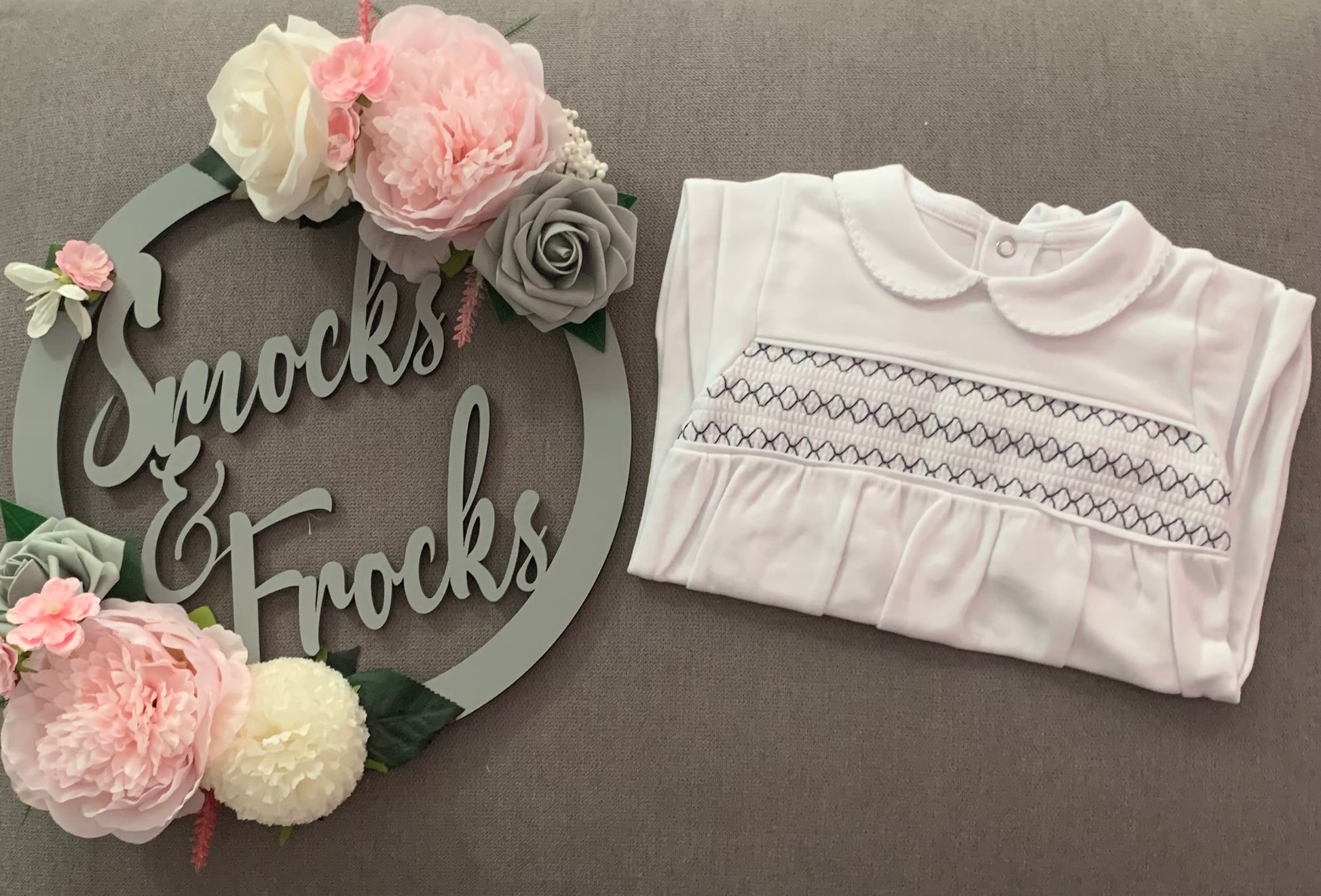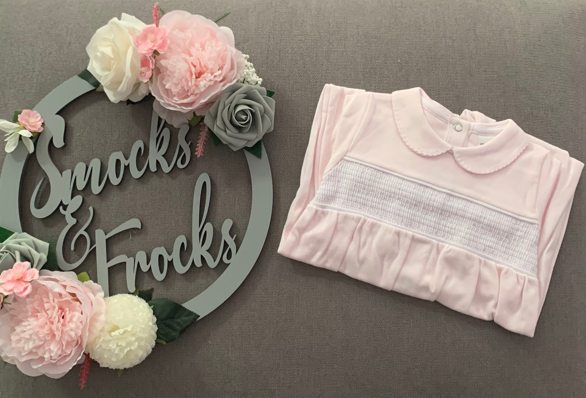Exquisite Super Soft Jersey Cotton Baby Grows with Enchanting Smock Details and Delightful Peter Pan Collar Accents.