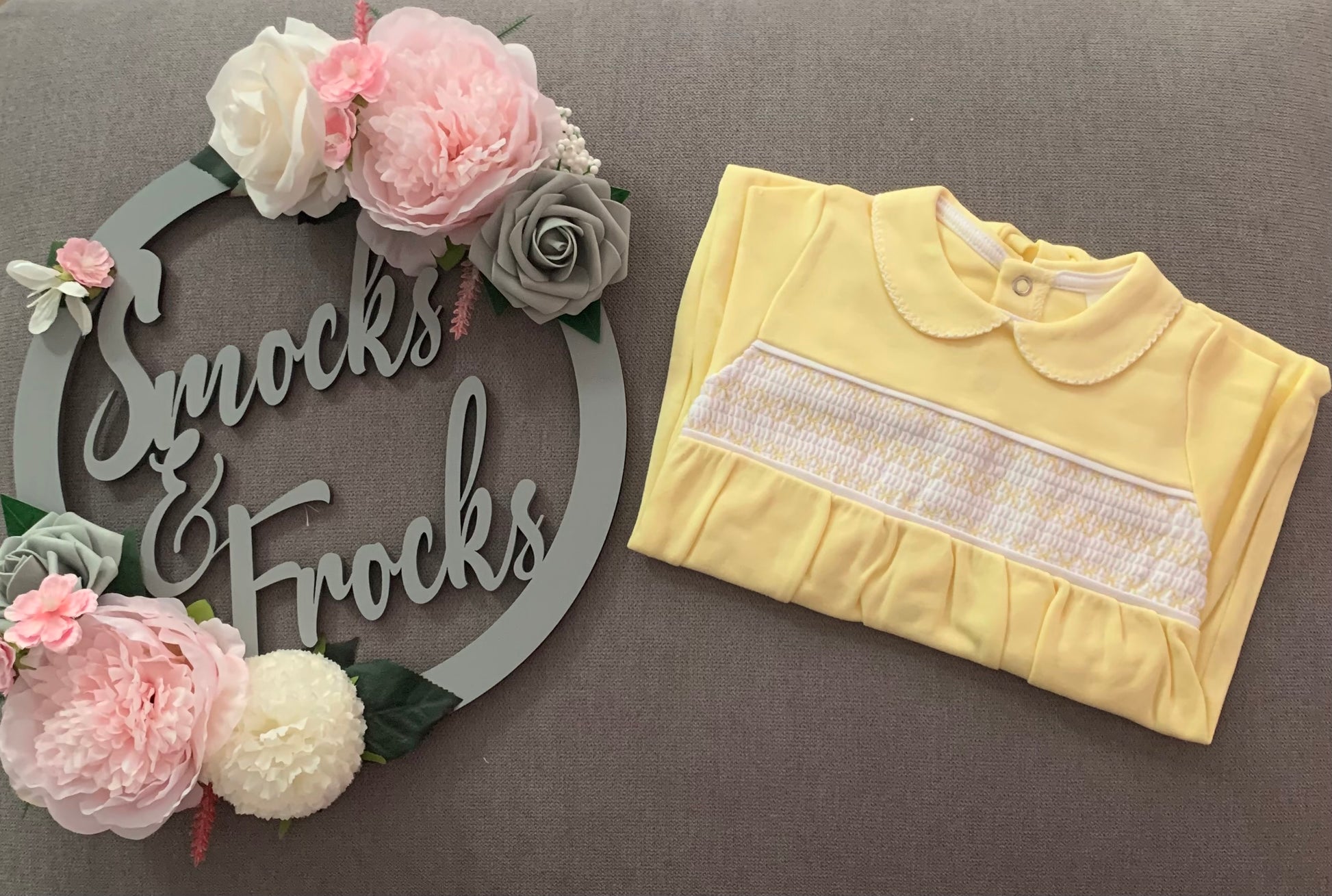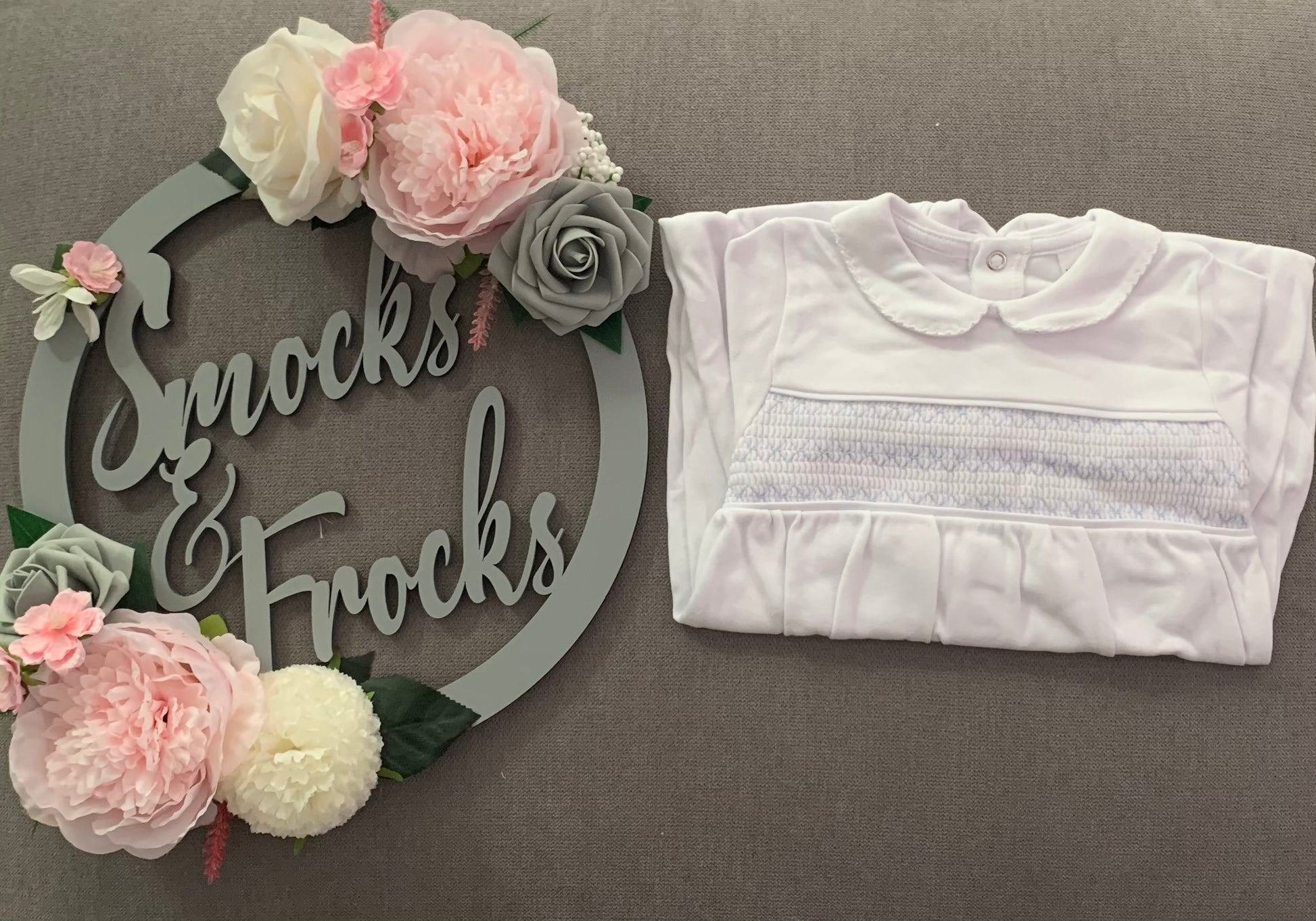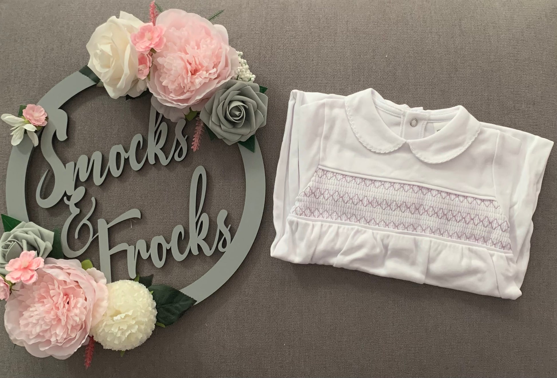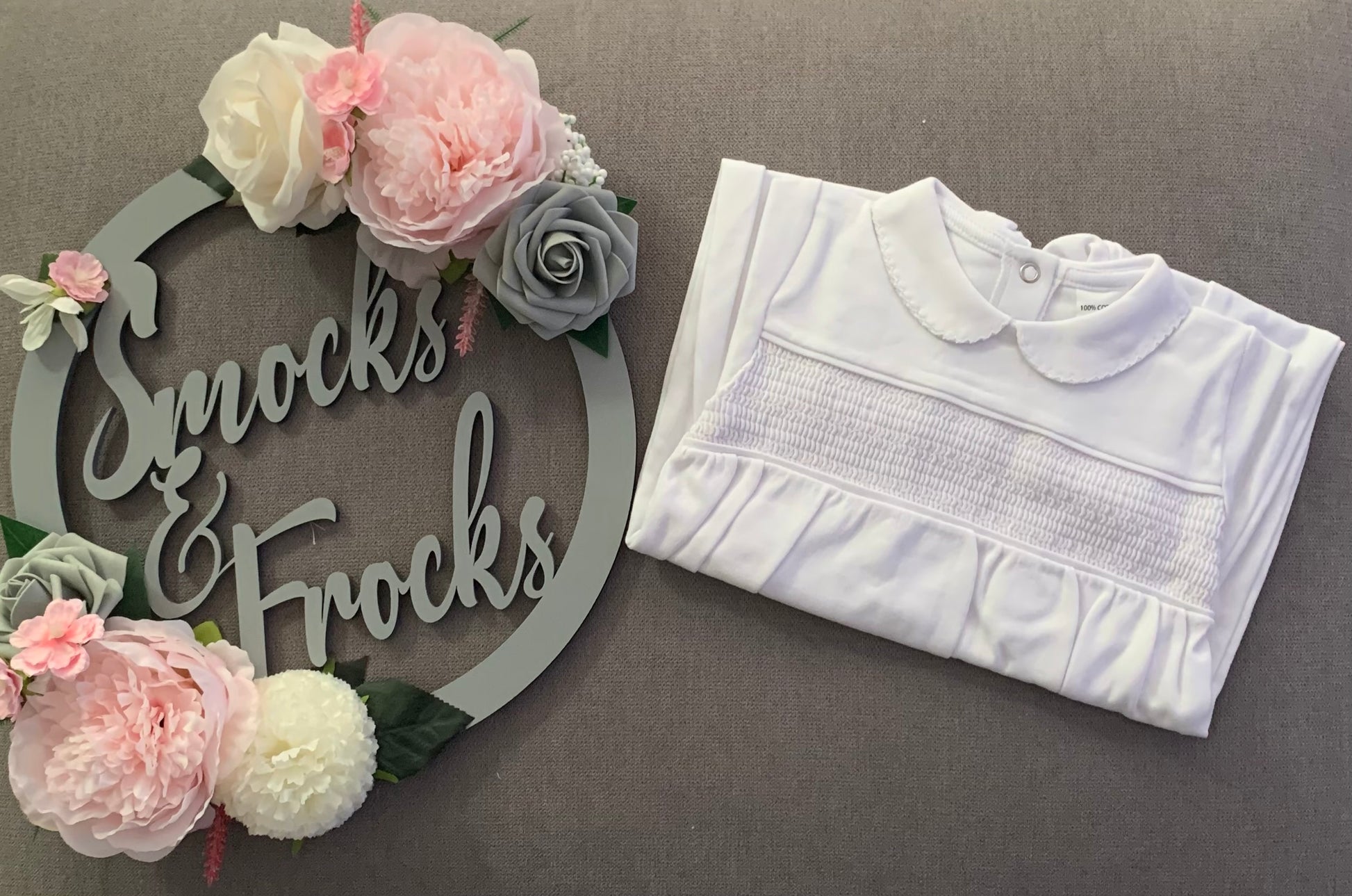 Exquisite Super Soft Jersey Cotton Baby Grows with Enchanting Smock Details and Delightful Peter Pan Collar Accents.