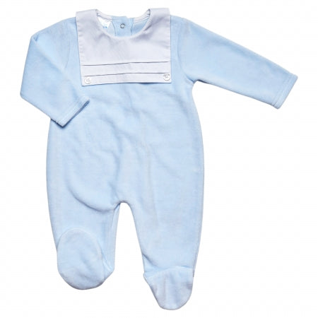 Introducing our Velour Blue Babygrow with Bib Detail, a cozy and stylish addition to your little one's wardrobe. Crafted from soft velour fabric, this babygrow ensures comfort and warmth for your baby.