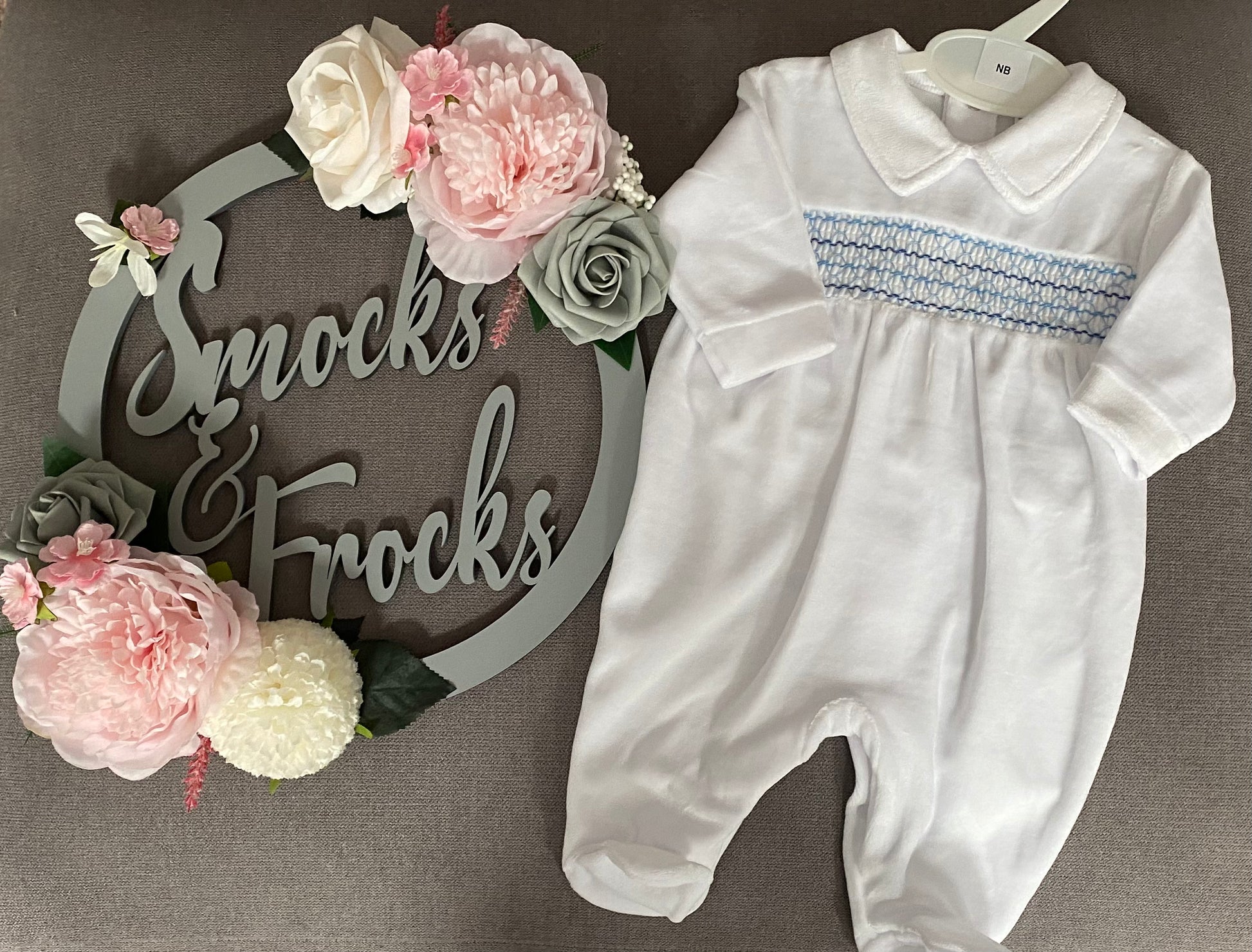 Dress your baby boy in luxurious comfort with our Boys Velour Smocked Babygrow, designed to keep him looking adorable and feeling snug throughout his early months.