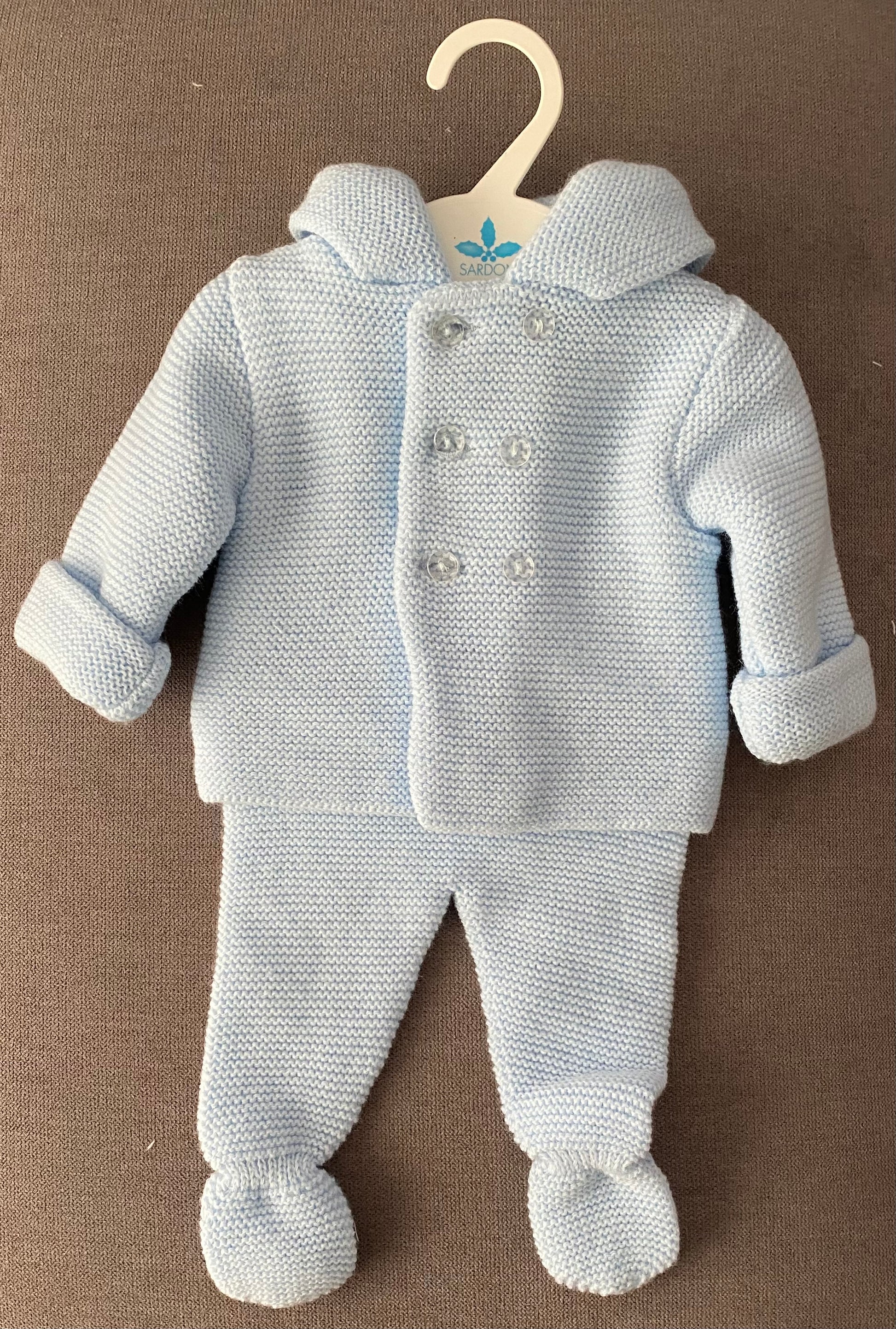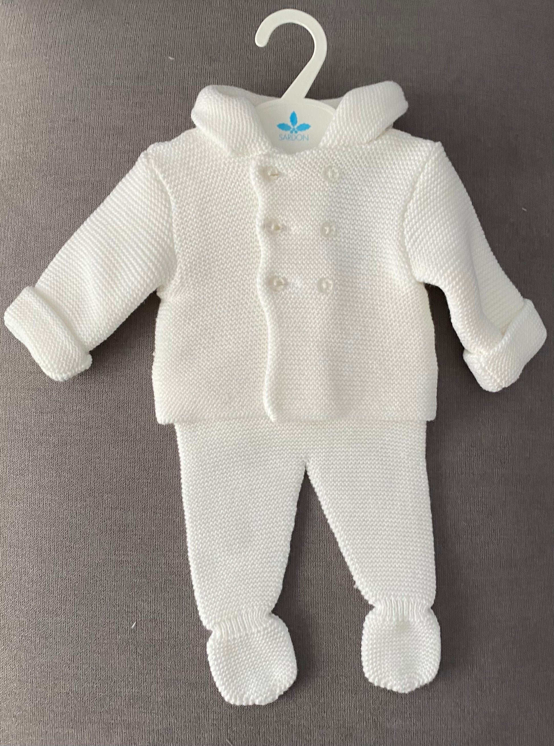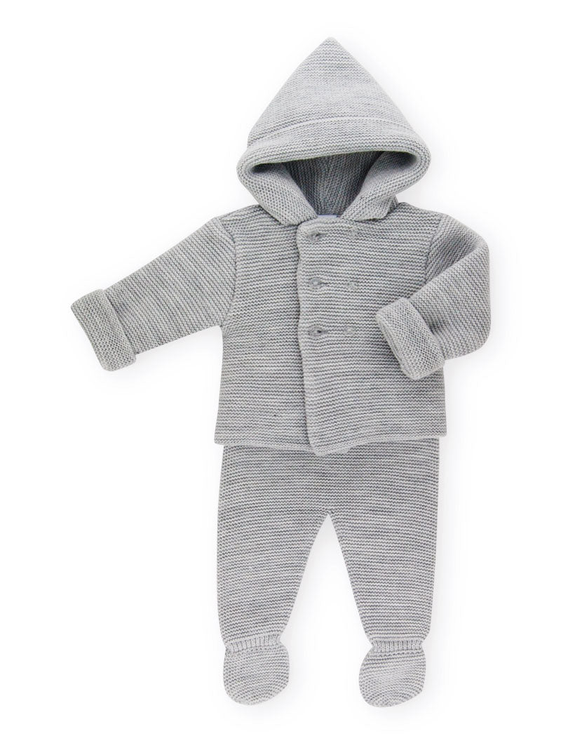 This cozy set features a soft knitted fabric that provides warmth and comfort for your baby. The set includes a jacket and matching trousers, each adorned with delightful hues of grey, blue, and white. The combination of colours adds a touch of elegance to your baby's ensemble.